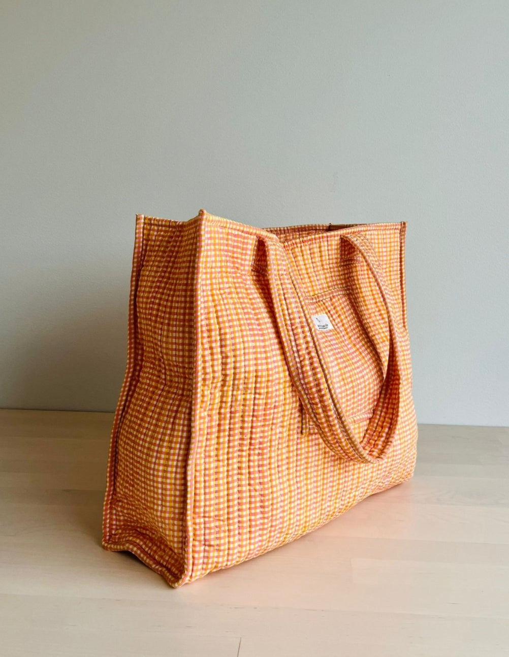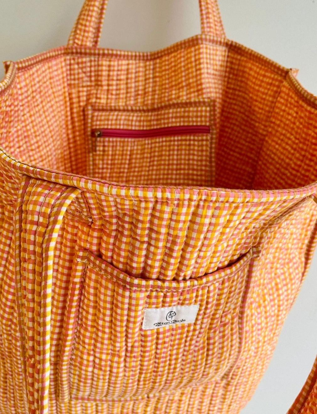 Laukun perinteinen handblock-painatus tekee jokaisesta kappaleesta yksilöllisen, ja sen ruutukuosi Mandarin Picnic Checks huokuu ajattomuutta ja iloista värien harmoniaa.